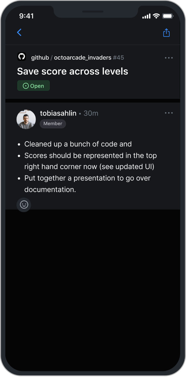 Tackle complex issues with task lists and track their status with new progress indicators. Convert tasks into their own issues and navigate your work hierarchy.
