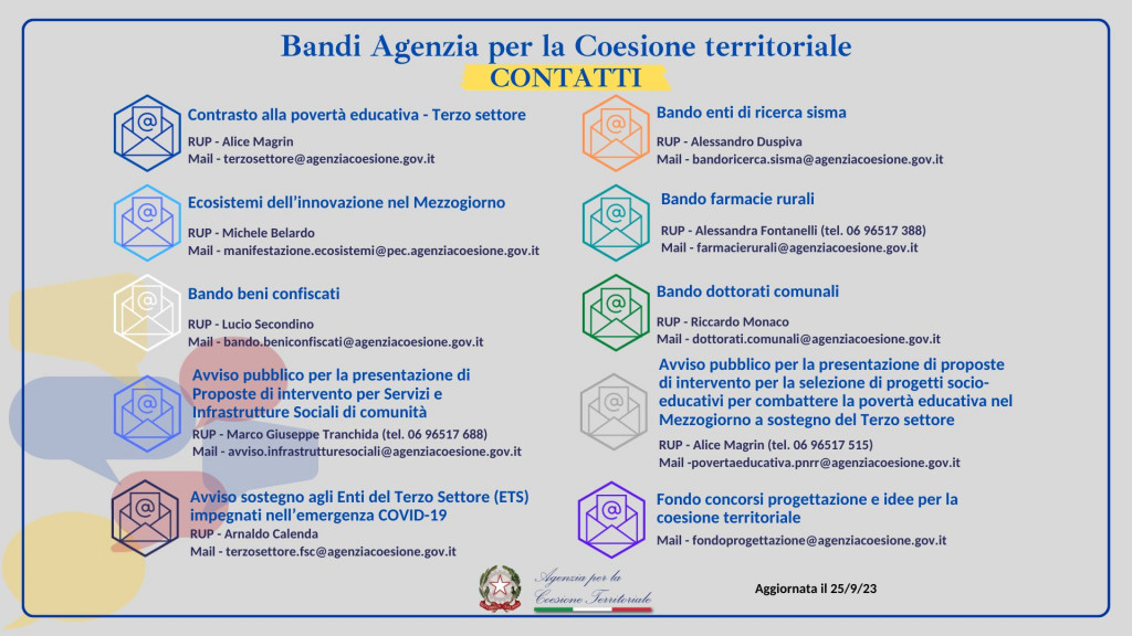 Questa pagina è dedicata alla pubblicazione di Bandi, Avvisi e altre procedure pubbliche a cura dell’Agenzia per la Coesione territoriale.