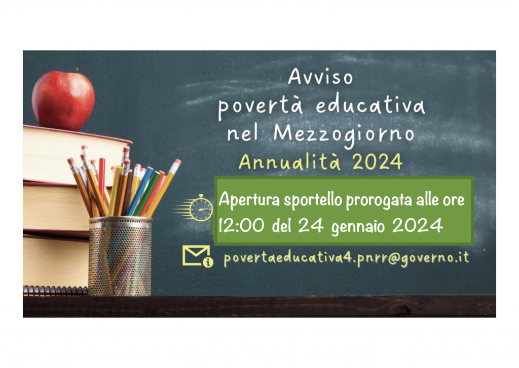 Prorogata l’apertura dello sportello per l’avviso pubblico per la presentazione di proposte di intervento per la selezione di progetti socio-educativi strutturati per combattere la povertà educativa nel Mezzogiorno, relativo all’annualità 2024