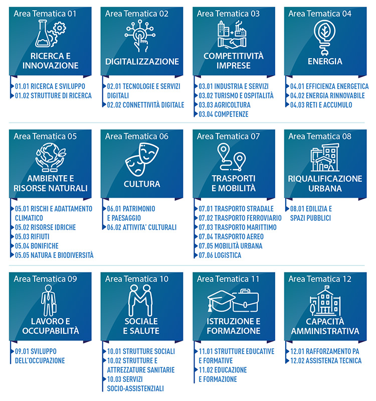 Gli interventi sono attuati utilizzando lo strumento del Piano Sviluppo e Coesione (PSC). Le 12 aree tematiche che caratterizzano gli attuali PSC, individuate dall’articolo 2 della Delibera CIPESS n. 2/2021, si intendono confermate anche per il ciclo di programmazione 2021-2027, in ragione della loro esaustività e per rendere più agevole il confronto con la programmazione dei precedenti cicli.