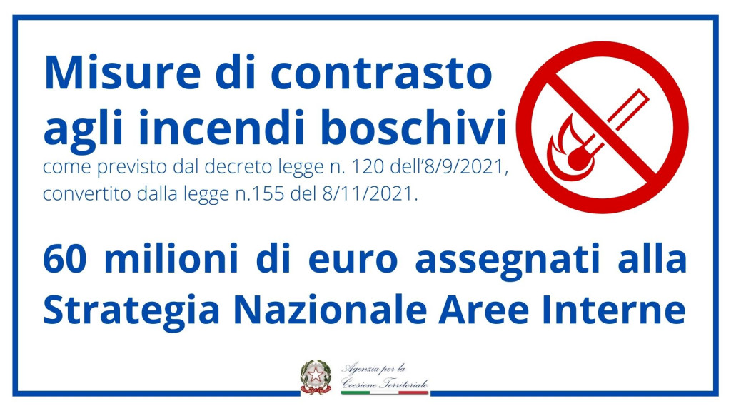 Ammontano a 60 milioni le risorse assegnate alla Strategia Nazionale per le Aree Interne (SNAI 2014-2020) nell’ambito del D.L. n. 120 dell’8 settembre 2021, convertito dalla L. 155 dell’8 novembre 2021 contenente misure di contrasto agli incendi boschivi (Decreto-legge Incendi).