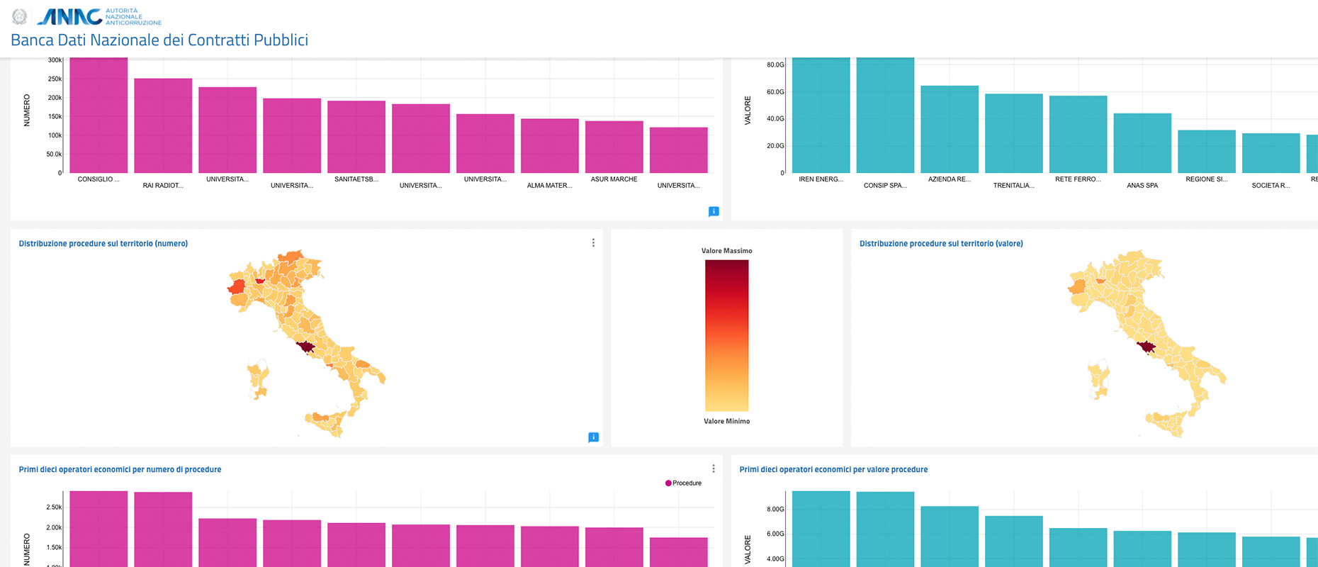 In the section Analytics of the ANAC Open Data Portal are available dashboards for the self-service data analysis on public contracts for works, services and supplies, and there’s also the possibility to apply filters on every statistics.