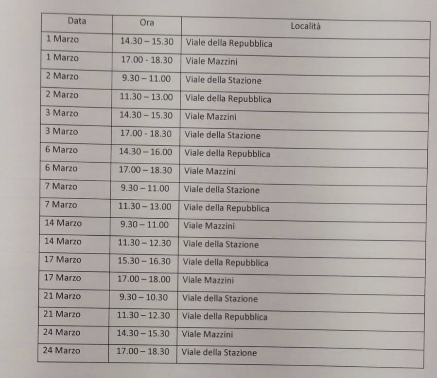 CONTROLLO ELETTRONICO PER IL SUPERAMENTO DEI LIMITI DI VELOCITA' Si comunica che, per i mese di MARZO 2023, il Comando di Polizia Locale, ha predisposto lo svolgimento di servizi di accertamento e contestazione delle violazioni alle norme del Codice della Strada, tramite apparecchiatura TELELASER TRUECAM mobile. Il servizio riguarda esclusivamente il superamento dei limiti di velocità. Ecco l'elenco delle strade interessate e relative date