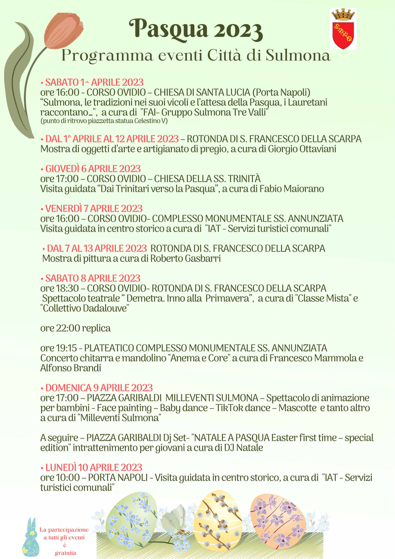 L'AMMINISTRAZIONE COMUNALE, IN OCCASIONE DELLE FESTIVITA' PASQUALI 2023, HA ORGANIZZATO UN PROGRAMMA DI EVENTI CON INIZIO DAL 1° APRILE 2023.