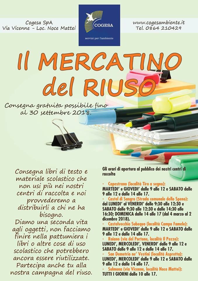 Tutti i giorni, fino al 30 Settembre 2018, presso i centri di raccolta in località Noce Mattei dalle ore 10.00 alle ore 17.00 è possibile consegnare (gratuitamente) libri di testo e materiale scolastico in buone condizioni (come vocabolari, zaini, grembiuli, astucci etc) i quali saranno presi in carico dal Cogesa e distribuiti ad associazioni o enti no profit, destinati ai bisognosi. Si tratta di una campagna di sensibilizzazione al riuso promossa dal Cogesa, contro il caro-libri. Il Comune di Sulmona co0llabora alla difussione di questo nuovo servizio del Cogesa.