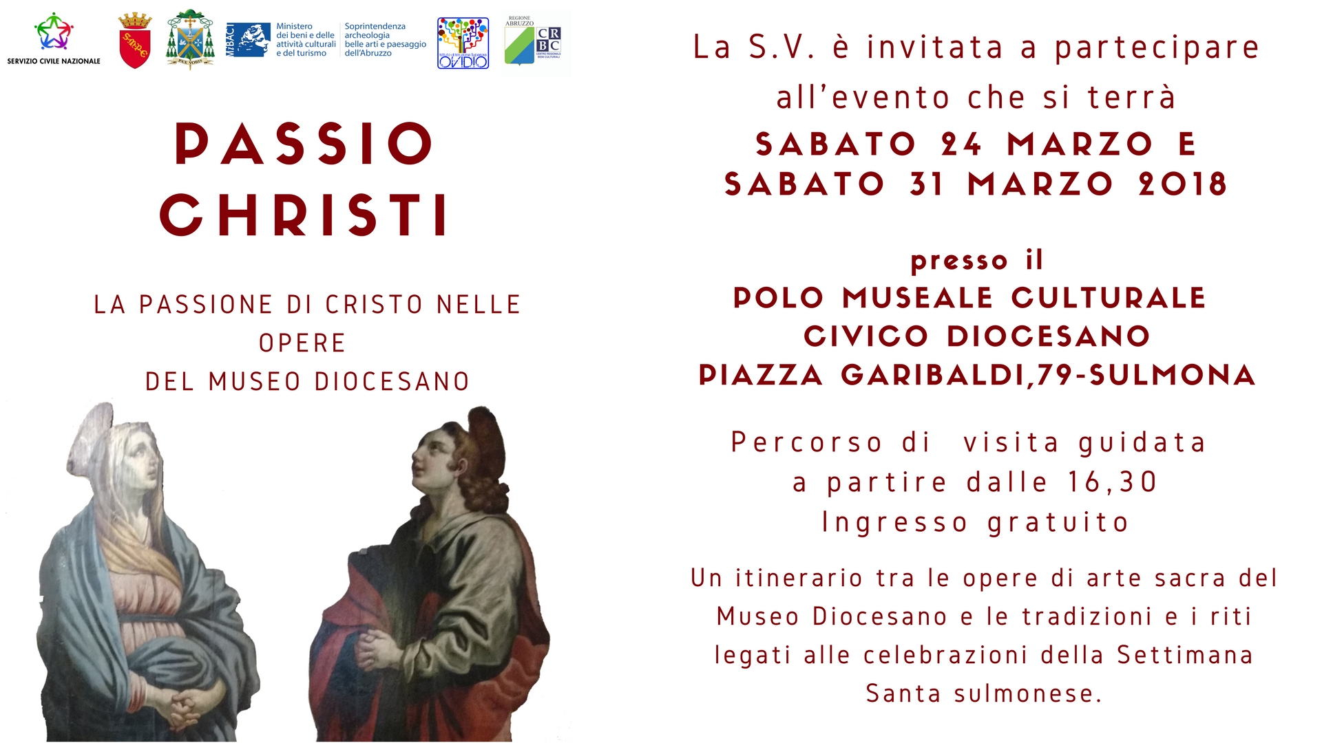 Due appuntamenti alla scoperta del Polo Museale Culturale Civico Diocesano situato in Piazza Garibalgi 79. Sabato 24 Marzo e Sabato 31 Marzo dalle 16.30 si svolgeranno percorsi di visite guidate a ingresso gratuito. Un itinerario tra le opere di arte sacra del Museo Diocesano, le tradizioni e i riti legati alle celebrazioni della Settimana Santa sulmonese. L' evento Passio Christi è organizzato dai giovani del Servizio Civile nell'ambito del progetto "Dire Fare Ricordare", in collaborazione con l'Ufficio Cultura del Comune di Sulmona, l'Ufficio d'Arte Sacra della Diocesi di Sulmona-Valva, la Soprintendenza Archeologia Belle Arti e Paesaggio dell'Abruzzo, il Liceo Artistico dell'Istituto d'Istruzione Superiore Ovidio, il Centro Regionale Beni Culturali.