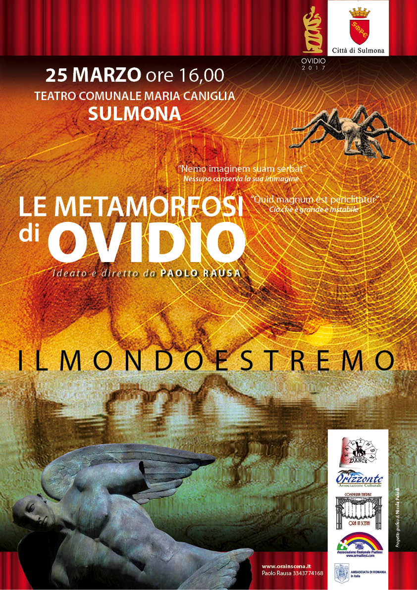 “Le Metamorfosi di Ovidio, Il Mondo Estremo”. E’ lo spettacolo che si terrà al Teatro Maria Caniglia il 25 marzo prossimo alle ore 16, organizzato dall’associazine culturale Orizzonte. Sarà “La Compagnia Ora in Scena” a rendere omaggio ad Ovidio, nell’ambito del Bimillenario, per la regia e testo di Paolo Rausa, aiuto Ornella Bongiorni. Interpretato da Massimo Loiacono, Armando Pisanello, Antonietta Nava, Vito Rubano, Tiziana Trenti, Paola Matesi, Dido Defendi, Alberto Bene, Giorgia Carluccio, Kalimba Studio Dance. Prevendita biglietti presso Ufficio Turistico Palazzo dell'Annunziata. Info: www.orainscena.it,paolo.rausa@gmail.com.