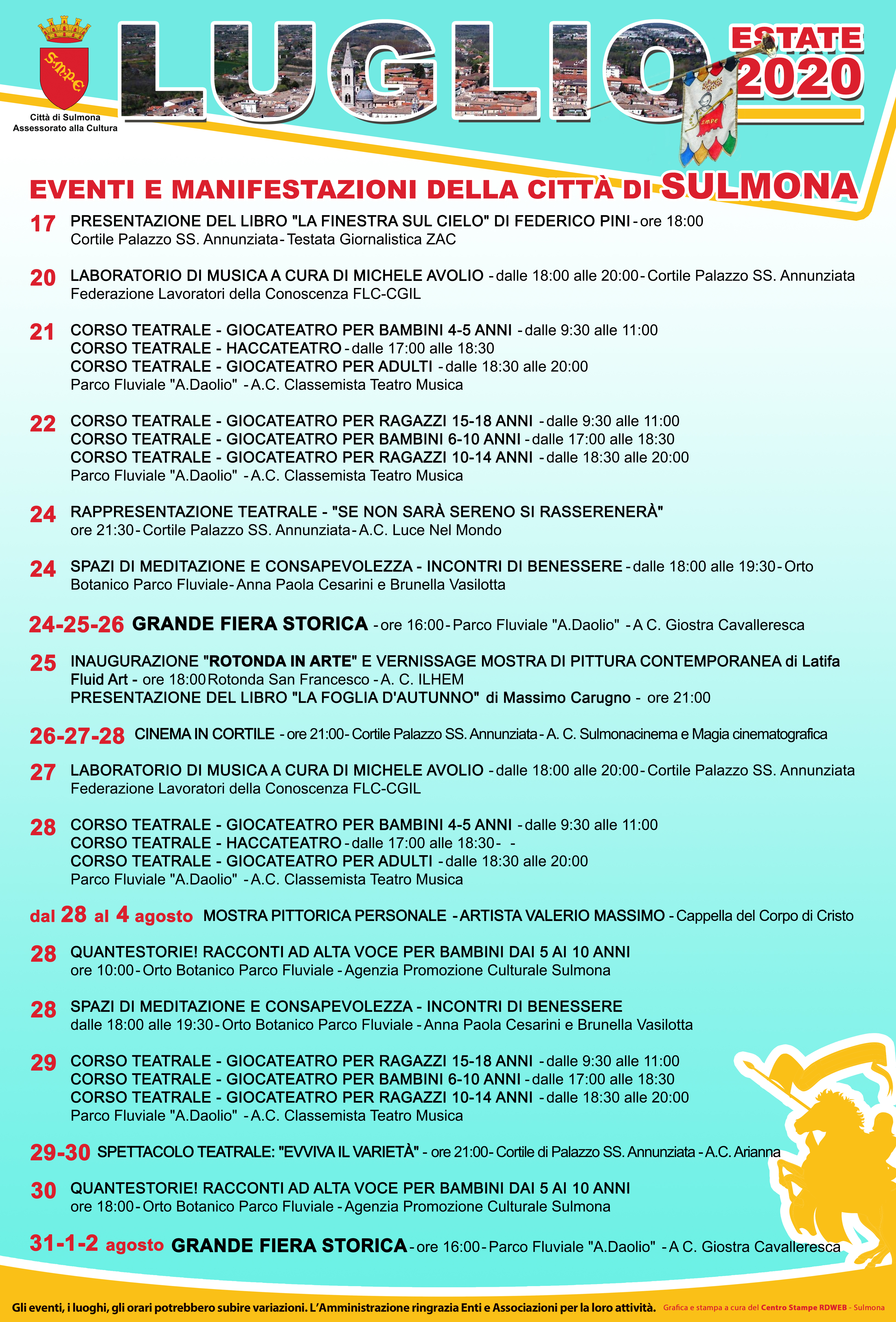 Si pubblica la locandina degli eventi culturali a Sulmona di Luglio 2020. L'assessore alla Cultura e Turismo Manuela Cozzi afferma: "Altre associazioni che volessero inviare le proposte per Agosto sono invitate a presentarle entro lunedì 20 luglio inviando mail all'indirizzo:&n...