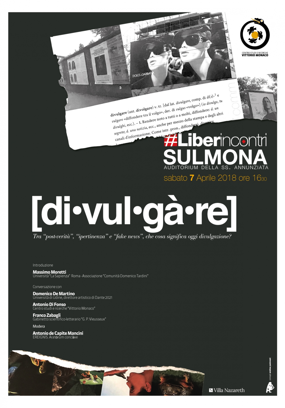 Divulgazione tra fake notizie e post verità è il tema dell'incontro di sabato 7 aprile 2018 nell'Auditorium dell'Annunziata promosso dal Centro Studi e Ricerche “Vittorio Monaco” in collaborazione con l’associazione Ereignis e la Comunità di “Villa Nazareth” ore 16,30.