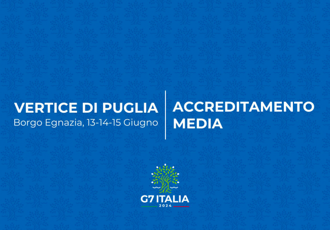 Da giovedì 13 a sabato 15 giugno 2024 si svolgerà a Borgo Egnazia (BR) la riunione dei Capi di Stato e di Governo dei paesi G7 presieduta dal Presidente del Consiglio dei Ministri, Giorgia Meloni. L’accreditamento anticipato dei rappresentanti dei media interessati è obbligatorio.