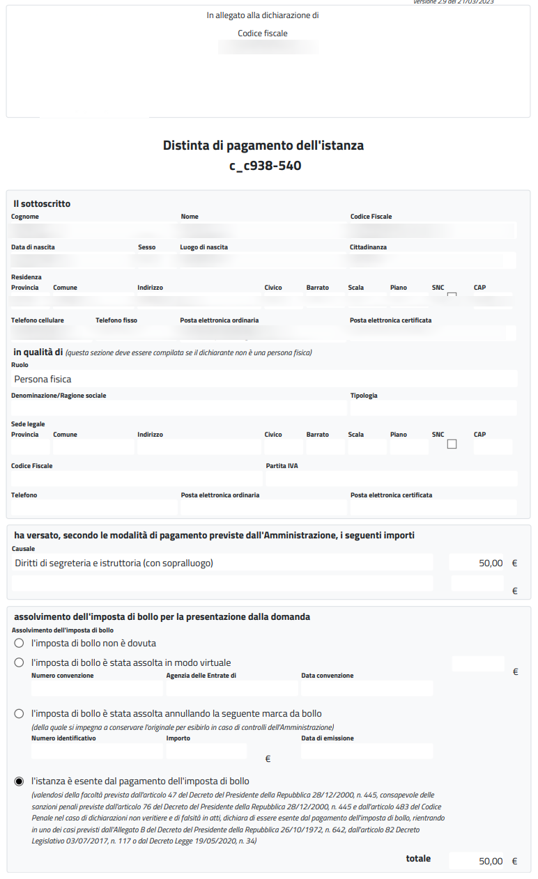 Questi importi riguardano sia l’eventuale versamento dei diritti di segreteria o oneri istruttori sia dell’assolvimento dell’imposta di bollo.